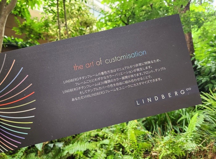 お写真左側の虹のようなカラーサンプルからお選びいただきカスタマイズできるのもLINDBERGのお楽しみのひとつ。お好みをうかがいながらお似合いのお色見をいくつかご提案させていただきます。