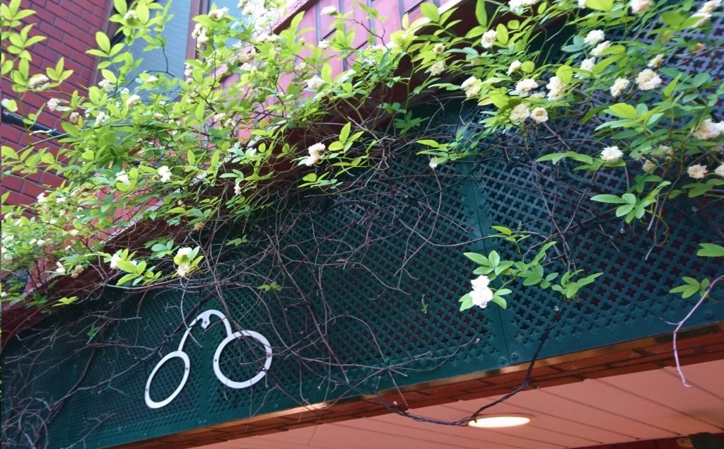 今日の1枚は入口の緑の扉の上にあるモッコウバラより。