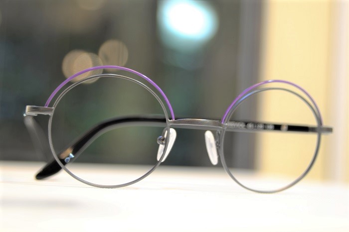 ベースとなる一重目の丸メガネはほんのりパールがかったグレー系のカラーリングで、二重目の表面にだけ!マスカラでも楽しめそうなちょうどいいパープルが施されています。(サイドや裏面にまでパープルを持ってこないところが日常使いしやすさのポイント)