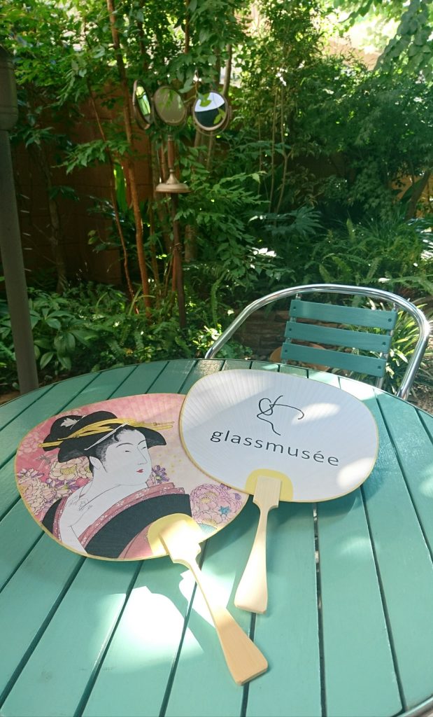 再びの暑さに合わせたかのように、グラスミュゼのロゴマーク入りの団扇が