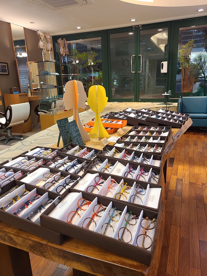 鮮やかなルージュカラーもあればシックなグレイもあったり・・・グリーンにイエロー、ブルー・・・オレンジにピンク、カーキ、そもそも表現が難しいお色見などなどパッと目を引くのに日常にスーッと溶け込む絶妙なバランスの「線と色」の眼鏡たち。きっとこのなかにお気に入りの1本を見つけていただけることと思うとコーディネートさせていただくのが今からとっても楽しみです。