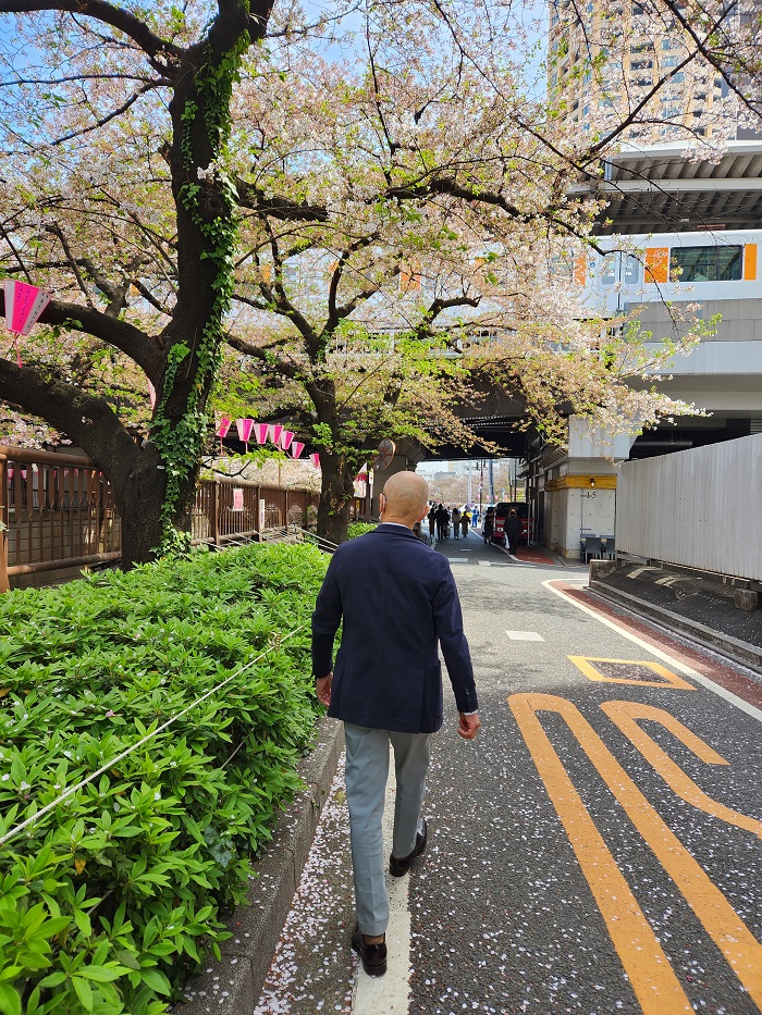 楽しかったね!よかったね!とそんなことを繰り返しながらの移動中、ちょっと歩幅をずらして桜吹雪のなか歩みを進める店長をパシャリ。
