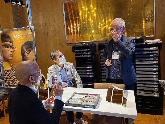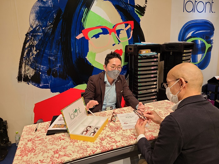 写真の黄色い箱に納められているのはアセテート生地を再利用したエシカルなシリーズ。良質な素材を無駄なく活用して最後は自然にかえるというものだそうで、このシリーズのためのロゴもlafonらしくて素敵です。なかでも一際目を引いたモネの睡蓮のような色調のモデルをはじめしっかりオーダーしてきました。lafontファンの皆さまにはどうぞお楽しみに♪