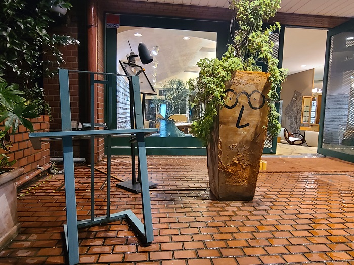 (photo: 雨に濡れてちょっぴり寒そうなミュゼの看板替わりの店長そっくりな鉢植えとイーゼル。いつもの額縁は風を避けて店内でお休憩中です)
