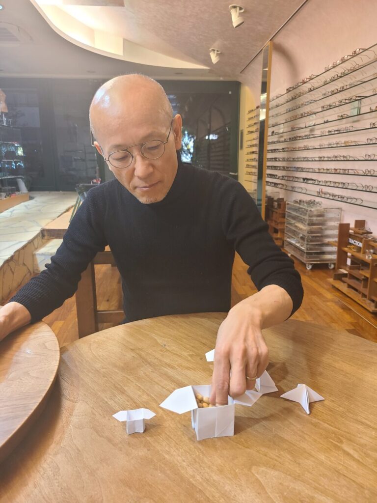 (photo: お気に入りの福豆をポリポリ。店頭はもちろん、裏庭や加工場などなど隅々豆撒きをしたので残り僅かなお豆を惜しみながら?!のひとときでした)
