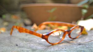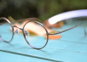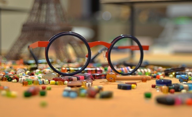エレガントで潔いインクブルーのアセテートでレンズをぐるり囲んだ丸眼鏡。ちょっと上よりに配された赤いラインがピリッと効いています。