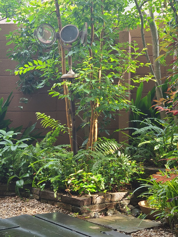 ふと裏庭を見たら緑に陽が射して雨粒がキラキラとっても綺麗でした。