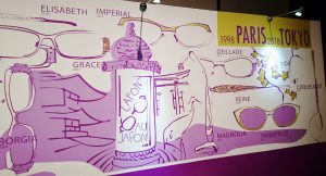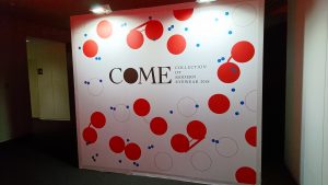 (photo: 壁いっぱいに飾られたパネル。この20年間に発表されたコレクションが描かれていました)