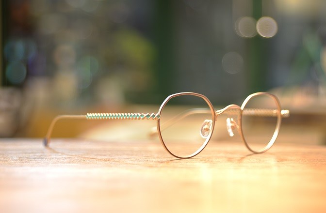 ミントグリーン系のお色味が効いたダイヤ型モチーフのテンプル(ツルの部分)と、フロント正面からの明るめブラウンに、テンプルエンドのアクセントはパープル系で。ベースとなるマットゴールドを軸に色とカタチで楽しませてくれるAKITTOのモデル。何度もトライすもようやくイメージが伝わる1枚が撮れました。(店長が撮ってくれました・笑)ちなみに、よくよく見るとフロントにはミル打ちも。(厚みのところに極小の点が施されています)