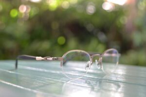 ティファニーブルーのようなお色味とグレージュ。正面から見たときに気づく2つの色は、凹溝にカラーリングを施すことで細く繊細ながらも絶妙な加減の存在感を叶えてくれています。レンズを囲むようにぐるり周囲にはミルグレイン(点描のデコレーション)も。テンプルエンドの特別なモチーフはお手にとって「何だろう?」とイメージしていただけたらと思います。