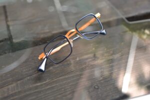 今日の1本は秋めくお色見のAKITTO。チタンフレームの上辺だけが糸になった、逆ナイロール仕様(いわゆる逆さメガネ)になっています。