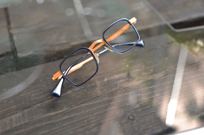 マスタードオレンジのメタル生地をベースに、綺麗なネイビーのアセテート生地でレンズをぐるり囲みはめ込んだ1本。どちらの色が最初に目に飛び込んでくるのかはアングル次第で変わる気がして、シンプルな面白さを感じます。エッジの効いた個性もありつつ”きちんと感”(収まりのよさ)も兼ね備えたBEAUSOLEILらしいデザインです。