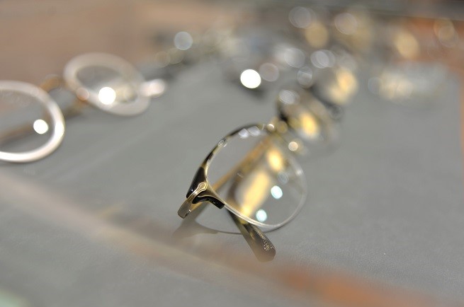 黄味がかった斑入りのアセテート生地と、アンティークゴールドの取り合わせが品よくエレガントな1本。ナイロール仕様(レンズの一部を糸で釣ってある構造)だからこそのニュアンスが楽しめるデザインです。猛暑でカジュアルな装いが多かった夏からシャツ&ジャケットやスーツにスイッチしたくなったとき、コーディネートの要として大活躍してくれそうですが、タートルネックのセーターにあわせても・・・等々、イメージが膨らみます。