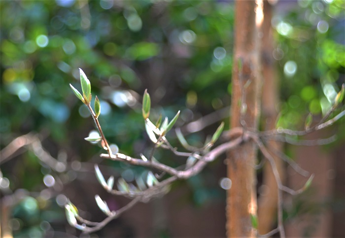 ここ数日の陽射しで芽が膨らんできたグラスミュゼ裏庭のヒメシャラ、