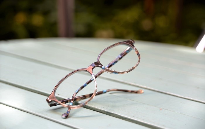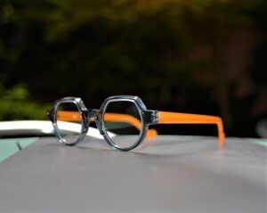 よく見ると木目調の上リムは裏を返せばミルキーな水色。下リムはというとそんなミルキーカラーと茶系の色々がリズミカルに折り混ざったところにクリア生地でうるみを添えるという懲りようで、お顔に載せて眺めればプレーンな描線が一際引き立ちよく映えます。