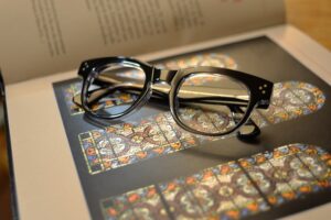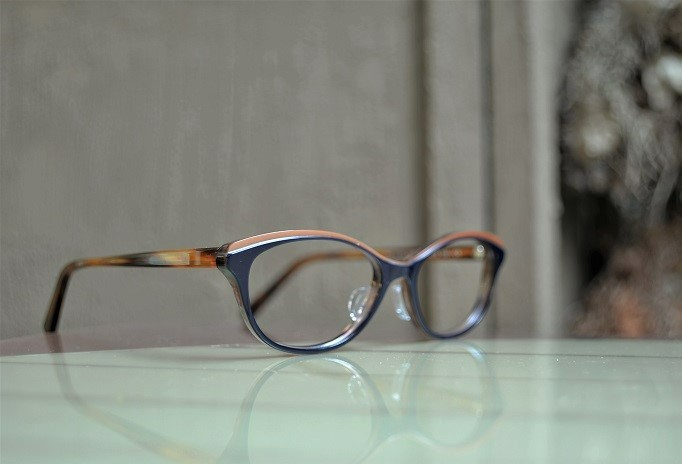 オールセル(プラスティック)のお作りですが、ピンクベージュのブロー部分の硬質なニュアンスがメタル素材のようにも見えて、フロントの大部分を占めるネイビーとのコントラストが魅力的なモデル。描線の美しさはお顔に載せるとさらに際立ちます。