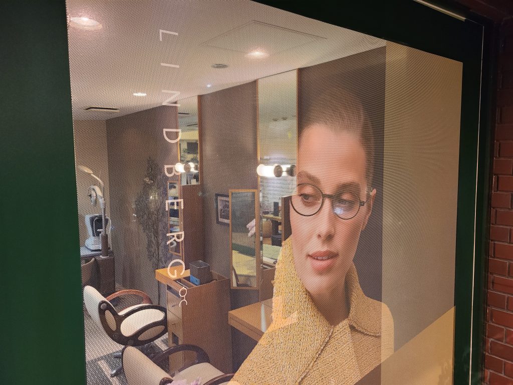 (photo: ミュゼ正面ガラスの夜のラッピングの様子から。角度によってモデルさんのお顔が見えたり見えなかったりで採光もばっちり!あとでうかがったら採光も取り入れたラッピングは初めての試みとのこと、感激でした)