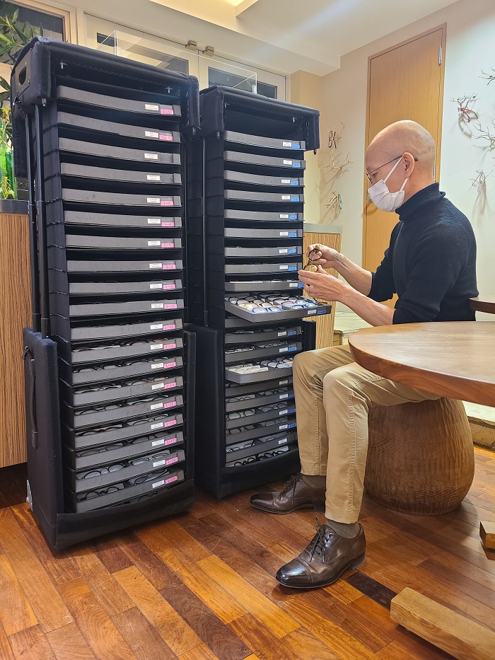 (室内では皆様にマスク着用をお願いしております。コーディネートさせていただき、いくつか気になる眼鏡がございましたら裏庭に出て、マスクを外してお顔全体のバランスなどをご覧いただくことをお勧めしております。その際には一組ずつご案内しておりますので自然光のもと、のびのびとした気分でリラックスしてお楽しみください)