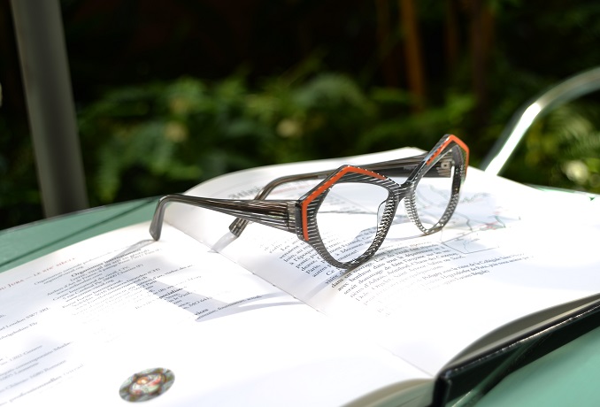 エッジの効いたフォルムにグレーのブラインドのような縞模様が涼しげで、何ともTRACTIONらしい+-のさじ加減を感じる1本。お顔全体の輪郭を綺麗に整え引き立ててくれるオレンジ色のラインもTRACTIONならではです。