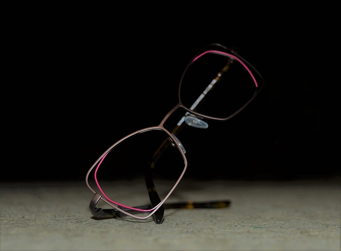 実際にレンズが収まるのはピンクの両サイドの部分まで。紫外線の照射量が増えることでほぼ無色からサングラスのように色濃く変化していく調光レンズをお使いいただくのにぴったりなデザインですが、極淡色のカラーレンズにするとアイシャドウのイメージでお使いいただけそうです。