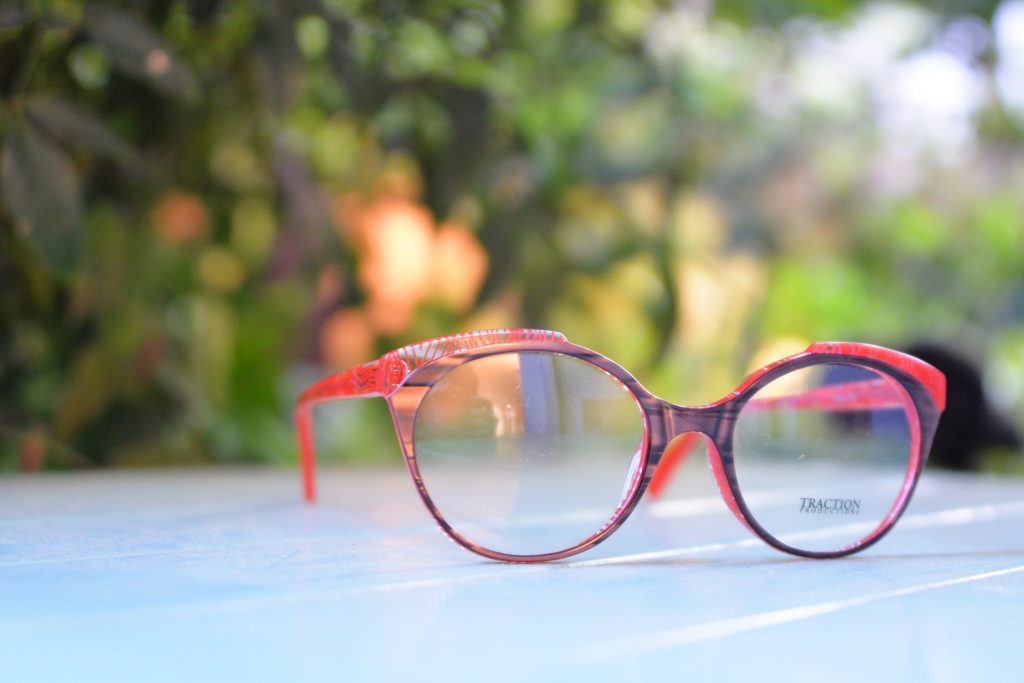 フロント上部とテンプル(つる)の部分にはクリア生地に発色のよい赤のラインが織りなす