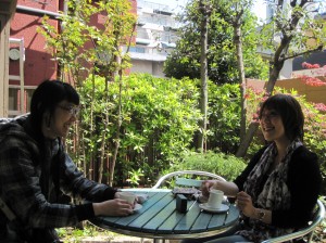 噂のサヤカさんと、お久しぶりにお会いしたサユウさん、ミュゼ裏庭で春風の中でのコーヒータイム