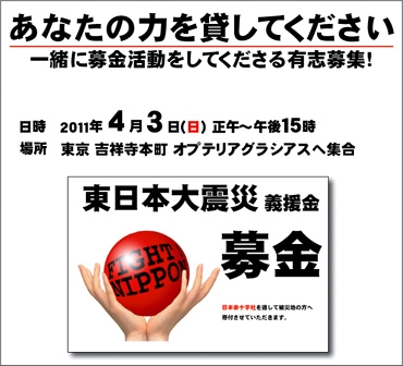 4月 2nd, 2011 Posted in お知らせ | No Comments »日本中、世界中の人たちがこのたびの大地震で被災された方々想い、