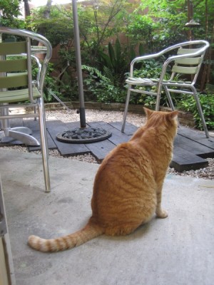 ガラス扉の前でこっちを真っ直ぐに向きつつ 凛々しい仁王立ちポーズで