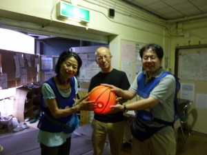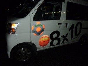 8x10の広報車両にて石巻までの珍道中。お届けしたのはLED内蔵のサッカーボールとバスケットボール、衝撃を受けると発光する優れものです。現地には発光が判るように夕刻から施設入りをして子供たちに。