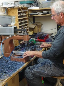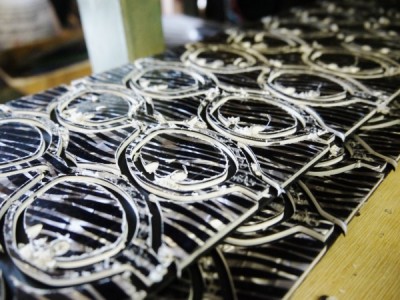 写真は生地からフロント(メガネの正面の部分)をレーザーで切り出しているところ・・・