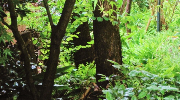 恵みの雨で裏庭はみずみずしい緑に、、、こう見るとどこかの林道にいるようだ