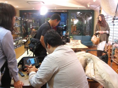 撮影中は、スタイリストさんやスタッフさんと流行の眼鏡やパソコン用レンズの話で盛り上がり、また、お店の一枚テーブルや美容室のようなフィッティングスペース、テラスも褒めていただいき、また撮影に使いたいとお話もちょうだいしました