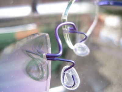 クリスタルガラスとメタル真鍮とローズクォーツを使った、アシンメトリーなデザイン