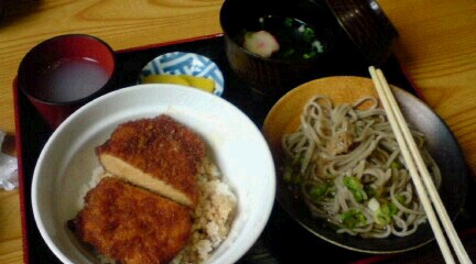 お昼休憩は地元「ニ男坊」で、越前そばとソースカツ丼のセット。