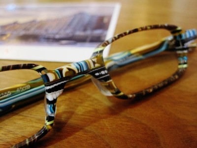 メガネは現地で探し求めた品、生地が灯のような暖かみがあります