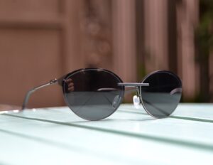 レンズの周りをぐるり囲んだインナーリムはグレーがかったソーダ色。