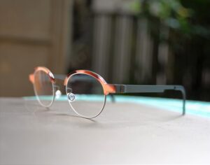 光の加減で落ち着いた赤に見えたり小豆色に見えるときもある・・・そんなメタル生地を間に挟むことでさらに奥行き感が出て、表情豊かにお顔を彩ってくれそうです。店頭で実際におかけいただく際には名脇役の両サイドのスリットにもご注目ください。