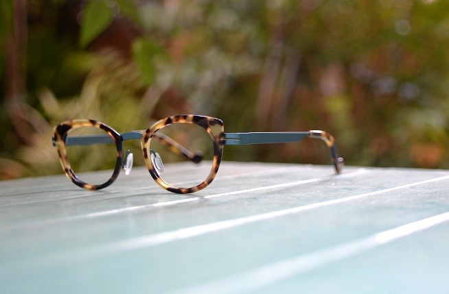 両サイドのツンとしたエッジと、テンプル(耳に掛ける部分)のつけ根に施されたスリット等々。ふっくらとした描線のなかにもフェイスラインをすっきり見せてくれるポイントが散りばめられた1本です。いわゆる鼈甲柄と呼ばれる斑入りのアセテートと、ブルーグリーンのシートメタルとの異素材合わせと色組も殊の外このデザインによく映えます。